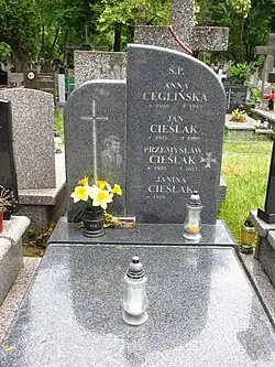 Został pochowany na cmentarzu Bródnowskim (kwatera 53F-2-3).