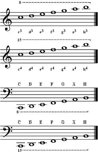 W muzyce organowej, dysponującej szeroką skalą, stosuje się przenośnik dwuoktawowy, oznaczany liczbą 15, będącą symbolem dwóch oktaw.