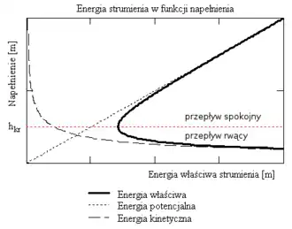 Przy każdej głębokości strumienia innej niż głębokość krytyczna jego energia właściwa będzie wyższa od minimalnej. Jeśli głębokość strumienia