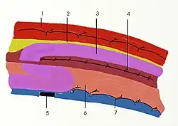 Ryc. 8. Pierwszy tzw. „szew Bassiniego” 1. Aponeurosis musculi obliq. ext.; 2. Musculus obliquus internus; 3. Musculus transversalis; 4. Fascia transversalis; 5. Peritoneum; 6. Ligamentum inguinale.