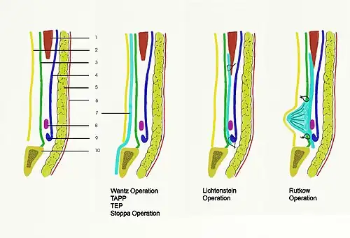 Stopniowo opanowała techniki operacyjne przepuklin pachwinowych stając się standardem postępowania operacyjnego. Ze względu na sposób wykonania operacji dzielimy hernioplastyki na:
