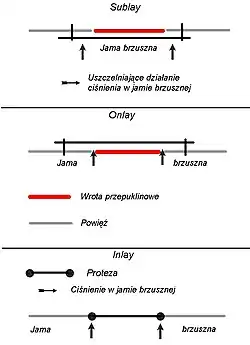 Niezależnie od techniki operacyjnej i zastosowanych materiałów mogą one być położone na trzy różne sposoby w zależności od działających sił i ich stosunku do otaczających tkanek[7] (Rycina 6 i 7):