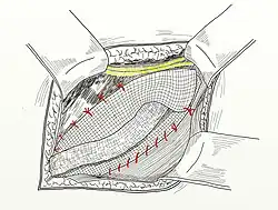 - Boczny płat rozcięgna mięśnia skośnego zewnętrznego przyszyty zostaje do przyśrodkowego płata tego rozcięgna, pokrywając drugą warstwę szwów (trzecia warstwa szwów).