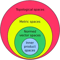Przestrzenie matematyczne mogą tworzyć hierarchię, gdzie dany typ przestrzeni posiada, oprócz cech właściwych sobie, także wszystkie cechy typu przestrzeni, z której się wywodzi. Np. wszystkie przestrzenie unitarne (z iloczynem skalarnym) są również unormowanymi przestrzeniami wektorowymi (ale nie odwrotnie – dlatego mamy hierarchię) ponieważ iloczyn skalarny indukuje normę wg wzoru: