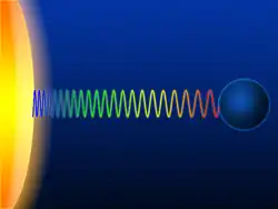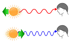 Jeżeli źródło światła oddala się od obserwatora, wówczas następuje przesunięcie ku czerwieni jeśli źródło zbliża się od obserwatora, wówczas następuje przesunięcie ku fioletowi Zależność ta występuje dla każdego rodzaju fal elektromagnetycznych, a jej naturę wyjaśnia efekt Dopplera. Tym samym, taki typ przesunięcia ku czerwieni jest nazywany dopplerowskim przesunięciem ku czerwieni. Jeżeli źródło oddala się od obserwatora z prędkością która jest dużo mniejsza od prędkości światła w próżni wówczas przesunięcie ku czerwieni wynosi: