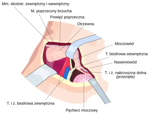 Nacięcie (skośne według Rutherforda-Morisona, lub pochodne), poprowadzone równolegle do więzadła pachwinowego, ciągnie się od guzka łonowego do kolca biodrowego przedniego górnego. Dostęp do przestrzeni zaotrzewnowej można uzyskać bez przecinania znacznych partii mięśni przedniej ściany jamy brzusznej. W celu odkrycia pęcherza moczowego należy przeciąć naczynia nabrzuszne dolne, a u kobiet dodatkowo więzadło obłe macicy. Z powodu ryzyka niepożądanych komplikacji struktury powrózka nasiennego pozostawia się nienaruszone[64][65][66].