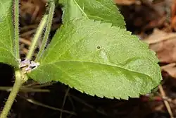 - Odwrotnie jajowate, zwężające się w krótki ogonek, w dolnej części łodygi całobrzegie, w górnej karbowano-piłkowane; naprzeciwległe, połyskujące[9].