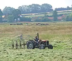 - pasowe – mechanizmem roboczym są sprężyny przymocowane do napędzanego pasa, który porusza się poziomo skośnie do kierunku jazdy. W zależności od ustawienia kierunku ruchu pasa maszyna przetrząsa lub zgrabia materiał.