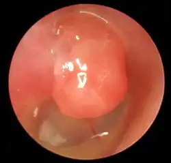 Opiera się na badaniu otoskopowym, które powinno być przeprowadzone szczególnie dokładnie przy pomocy lupy usznej Siegla lub mikroskopu usznego (mikrootoskopia), gdyż niekiedy niewielka perforacja w części wiotkiej błony bębenkowej może pozostać niezauważona. Niezbędnym podczas badania otoskopowego jest ssak, którym dokładnie powinno się oczyścić zalegającą wydzielinę zapalną, która często przysłania wgląd w dalszą część przewodu słuchowego zewnętrznego. Perforacja może być też przysłonięta przez zaschniętą wydzielinę ropną lub przez polip. Obecność polipa w badaniu otoskopowym zawsze powinna nasuwać podejrzenie perlaka, gdyż perlak obecny w uchu środkowym stymuluje wyściółkę jamy bębenkowej do odczynowej reakcji zapalnej z tworzeniem bogato unaczynionej ziarniny oraz bujania i tworzenia zmian rozrostowych w postaci polipów usznych.