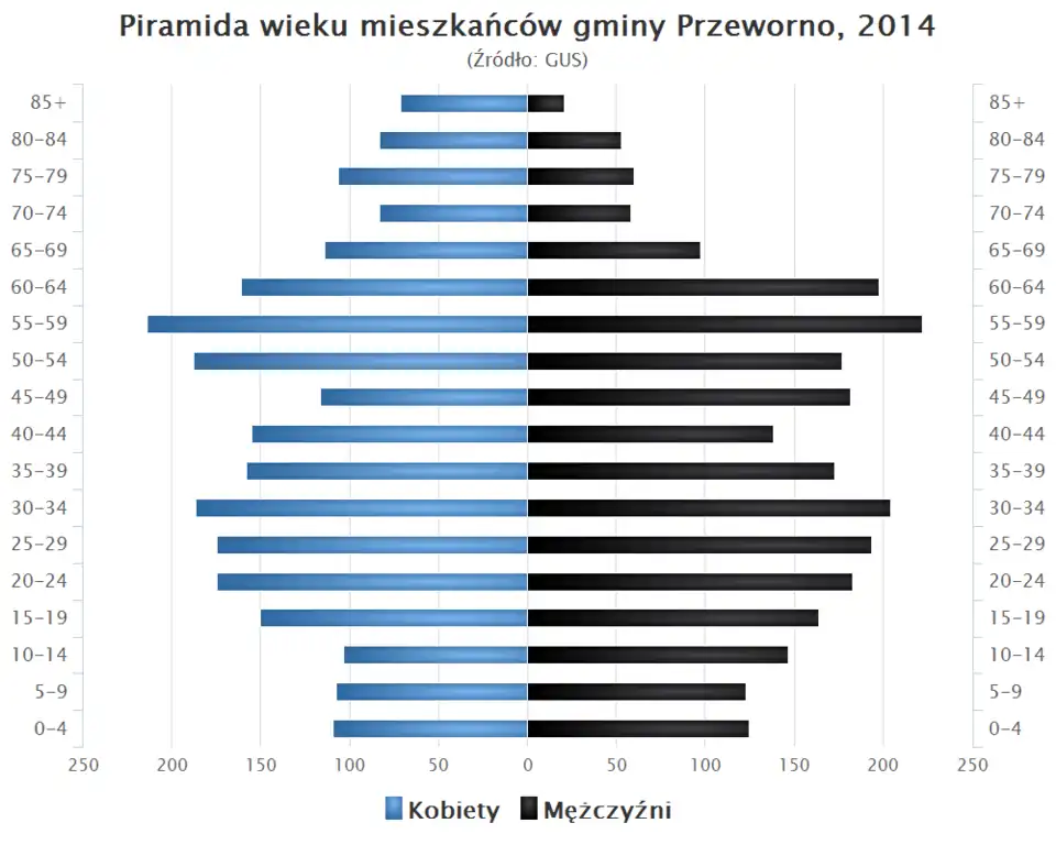 - Piramida wieku mieszkańców gminy Przeworno w 2014 roku[1].