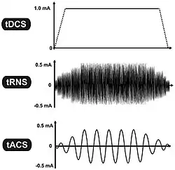Przy dostosowaniu średniej amplitudy sygnałów tRNS (DC-offset) można uzyskać jednokierunkowy przepływ prądu podobny do tDCS[42] i nawet osiągnąć lepszy efekt modulacyjny kory mózgowej[43][44][45], co podnosi możliwość, że tRNS + DC-offset może być bardziej skuteczny w poprawie funkcji poznawczych.