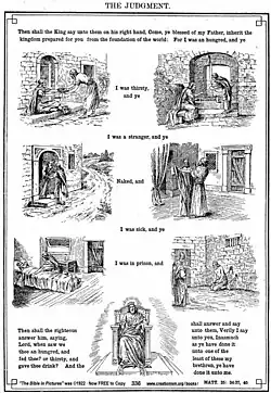 Gdy Syn Człowieczy przyjdzie w swej chwale i wszyscy aniołowie z Nim, wtedy zasiądzie na swoim tronie pełnym chwały. I zgromadzą się przed Nim wszystkie narody, a On oddzieli jednych [ludzi] od drugich, jak pasterz oddziela owce od kozłów. Owce postawi po prawej, a kozły po swojej lewej stronie. Wtedy odezwie się Król do tych po prawej stronie: "Pójdźcie, błogosławieni Ojca mojego, weźcie w posiadanie królestwo, przygotowane wam od założenia świata! Bo byłem głodny, a daliście Mi jeść; byłem spragniony, a daliście Mi pić; byłem przybyszem, a przyjęliście Mnie; byłem nagi, a przyodzialiście Mnie; byłem chory, a odwiedziliście Mnie; byłem w więzieniu, a przyszliście do Mnie". Wówczas zapytają sprawiedliwi: "Panie, kiedy widzieliśmy Cię głodnym i nakarmiliśmy Ciebie? Spragnionym i daliśmy Ci pić? Kiedy widzieliśmy Cię przybyszem i przyjęliśmy Cię? Lub nagim i przyodzialiśmy Cię? Kiedy widzieliśmy Cię chorym lub w więzieniu i przyszliśmy do Ciebie?" A Król im odpowie: "Zaprawdę, powiadam wam: Wszystko, co uczyniliście jednemu z tych braci moich najmniejszych, Mnieście uczynili". Wtedy odezwie się i do tych po lewej stronie: "Idźcie precz ode Mnie, przeklęci, w ogień wieczny, przygotowany diabłu i jego aniołom! Bo byłem głodny, a nie daliście Mi jeść; byłem spragniony, a nie daliście Mi pić; byłem przybyszem, a nie przyjęliście Mnie; byłem nagi, a nie przyodzialiście Mnie; byłem chory i w więzieniu, a nie odwiedziliście Mnie." Wówczas zapytają i ci: "Panie, kiedy widzieliśmy Cię głodnym albo spragnionym, albo przybyszem, albo nagim, kiedy chorym albo w więzieniu, a nie usłużyliśmy Tobie?" Wtedy odpowie im: "Zaprawdę, powiadam wam: Wszystko, czego nie uczyniliście jednemu z tych najmniejszych, tegoście i Mnie nie uczynili". I pójdą ci na mękę wieczną, sprawiedliwi zaś do życia wiecznego».