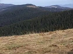 ![]() Przysłop (u góry po lewej stronie) i odchodzący od niego boczny grzbiet. Widok od południowej strony | |