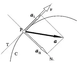 Jeżeli punkt porusza się po torze krzywoliniowym[4], wówczas jego całkowite przyspieszenie może być rozłożone na dwie składowe: prostopadłą do toru ruchu zwaną przyspieszeniem dośrodkowym lub normalnym (oznaczanym ) i składową równoległą do toru, zwaną przyspieszeniem stycznym (ozn. ).
