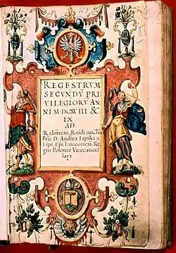 - ↑ W I Rzeczypospolitej zapisy o dokonanych czynnościach prawnych potwierdzone były dla prawomocności transakcji i wystawiania dokumentu w kancelarii koronnej w księdze wpisów Liber Inscriptionum Metryki Koronnej.