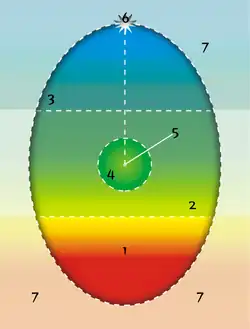 Owalna struktura psychiki jest podzielona na trzy części, które reprezentują różne poziomy: niższy, średni i wyższy. Okrąg w środku przedstawia pole świadomości. Poza dużym owalem rozciąga się pole nieświadomości zbiorowej. Każdy z tych poziomów przedstawiony jest linią przerywaną, gdyż jest współprzenikalny. Zawartość psychiki nieustannie przemieszcza się pomiędzy poziomami i przestrzeniami (także indywidualną i zbiorową), podobnie jak ma to miejsce w trakcie osmozy w przestrzeniach międzykomórkowych roślin.