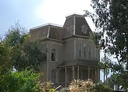 Do nadzoru scenografii początkowo wyznaczono Henry’ego Bumsteada i Roberta F. Boyle’a, lecz z uwagi na inne zobowiązania zmuszeni byli odmówić. W ich miejsce 30 listopada zaangażowano Josepha Hurleya i na jego prośbę Roberta Clatworthy’ego[87]. Ze względu na krótki czas obydwaj od razu przystąpili do projektowania domu Batesa i motelu[o][89]. Reżyser największą wagę przywiązywał do detali wystroju wnętrz[90]. Całkowite koszty konstrukcyjne domu wyniosły 15 tys. dolarów, co było najdroższym elementem planu filmowego[p][91]. Zgłaszano różne sugestie co do jego pierwowzoru; od komiksów Charlesa Addamsa po obrazy Edwarda Hoppera. Hitchcock twierdził, że był to popularny typ domu w północnej Kalifornii, nazywany „gotykiem” lub „pierniczkiem kalifornijskim”[81][91][92]. Łączne koszty dla całej ekipy tworzącej film wyniosły 62 tys. dolarów[93].