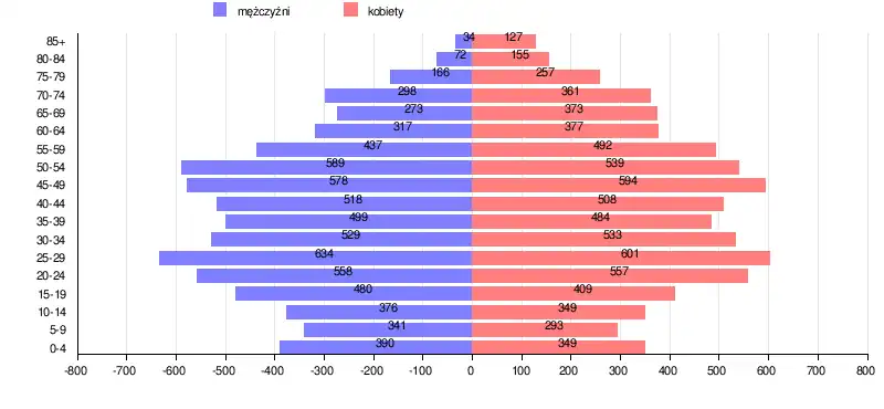 - ↑ Bank Danych Lokalnych Głównego Urzędu Statystycznego: Ludność. Stan ludności i ruch naturalny. Ludność wg grup wieku i płci (Stan w dniu 31 XII 2010 r.). 2014-10-05. [dostęp 2015-08-13]. (pol.).
