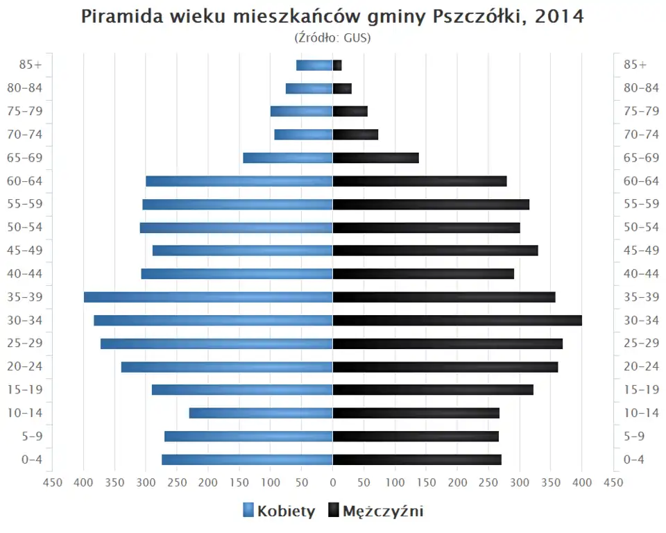 - Piramida wieku mieszkańców gminy Pszczółki w 2014[1]: