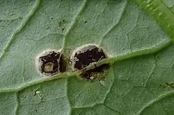 ![]() Objawy na górnej stronie liścia ostrożnia warzywnego | |