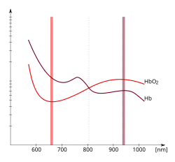 - dla długości fali 660 nm istnieje wtórny peak absorbancji dla deoksyhemoglobiny[8], przy jednoczesnej mniejszej absorbancji hemoglobiny utlenowanej[10] (przez co krew utlenowana wydaje się bardziej czerwona niż krew odtlenowana)[6]