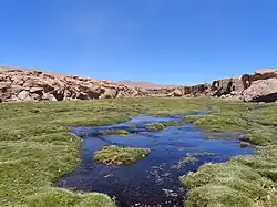Mokradła z roślinami poduszkowymi w obrębie formacji puna tworzą się na niższych wysokościach, zwykle ok. 4000 m n.p.m. i mniej[6]. Dominują na nich Oxychloe andina, Patosia clandestina[12][6], Plantago rigida[6], rośliny z rodzajów: Oreobolus[12], sit Juncus, turzyca Carex, sitowie Scirpus, goryczka Gentiana, poryblin Isoetes, ouryzja Ourisia, Hypsela, Lilaeopsis[6].