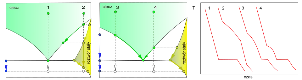 Współrzędne wykresów fazowych: x – względne udziały składników („niebieskiego” i „żółtego”), y – temperatura (T)