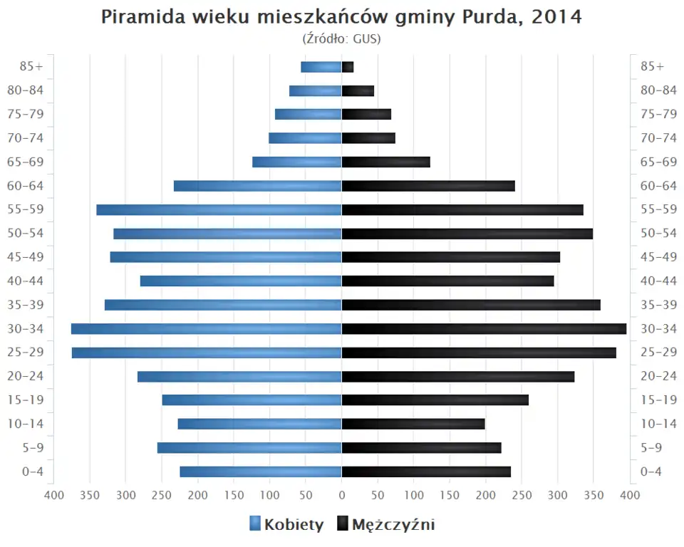 - Piramida wieku mieszkańców gminy Purda w 2014 roku[1].