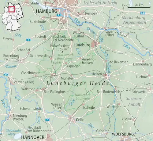 - 1 2 Lage & Abgrenzung [online], naturpark-lueneburger-heide.de [dostęp 2024-04-25] [zarchiwizowane z adresu 2009-12-15] (niem.).