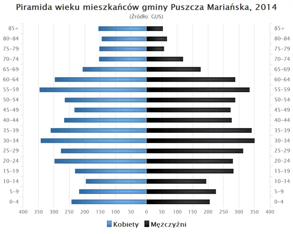 - Piramida wieku mieszkańców gminy Puszcza Mariańska w 2014 roku[7].