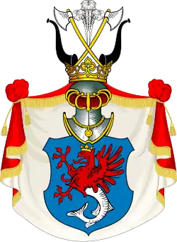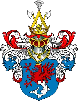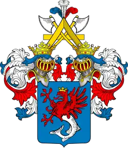 Putkamer Baron II (Podkamer III Baron, Puttkamer, Putkamer I odmienny): W polu błękitnym rybogryf czerwony z ogonem rybim srebrnym. Klejnot: nad hełmem w koronie dwie oksze srebrne na złotych styliskach, w wachlarz, z takąż krokwią za nimi, na której trzy pióra strusie: błękitne, srebrne, czerwone. Labry: błękitne i czerwone, podbite srebrem.