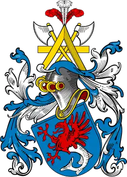 Putkamer Ia (Puttkamer): W polu czerwonym rybogryf czarny z nogami złotymi i w koronie złotej z ogonem rybim srebrnym. Klejnot: nad hełmem w koronie dwie oksze srebrne na czerwonych styliskach, w wachlarz, pomiędzy nimi trzy pióra strusie i pas czerwony przepleciony między nimi. Labry: czerwone, podbite srebrem.