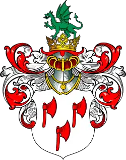 Putkamer II (Podkamer, Puttkamer, Bradacice albo Oksza odmienny): W polu srebrnym trzy toporki czerwone w lewo (2 i 1). Klejnot: nad hełmem w zawoju czerwono-srebrnym smok skrzydlaty (zielony?). U Ostrowskiego toporki ustawione są w prawo, barwa pola i godeł są zamienione, zaś w miejsce smoka znajduje się pół gryfa.