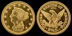 - ↑ 1848 $2.50 CAL. (Regular Strike), „PCGS” [dostęp 2022-12-15].