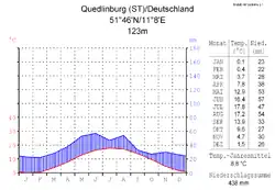 Średnia roczna temperatura powietrza w Quedlinburgu wynosi 8,8 °C. Najcieplejszymi miesiącami są lipiec i sierpień (średnia temp. 17.8 °C-17,2 °C), a najchłodniejszymi styczeń i luty (średnia temp. 0.1 °C-0,4 °C).
