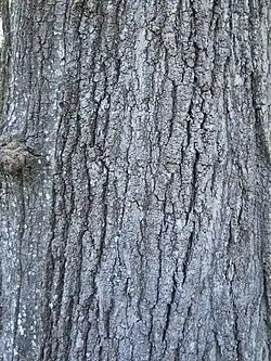 - Zrzucające liście drzewo dorastające do 30 m wysokości. Kora jest popękana i ma brązową lub czarną barwę[7].