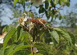 - Pierzasto złożone z 5–7 listków. U nasady z ogruczolonymi przylistkami. Osadki liściowe owłosione lub nagie, ale zawsze mocno ogruczolone i kolczaste. Listki jajowate do eliptycznych, zielone, owłosione i ogruczolone po obu stronach, rzadko z wierzchu nagie. Na brzegu piłkowane gruczołowato[6].
