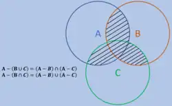 Różnica zbiorów nie jest rozdzielna lewostronnie względem sumy ani przekroju zbiorów, ale zachodzą podobne równości, zaliczane do praw De Morgana[10][11]: