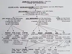 Syn Berisch Aschera to Jӓckel Ascher, urodził się 25 stycznia 1775 w Kamieniu Pomorskim. W 1812 Jӓckel Ascher przyjął nazwisko Jakob Levy. Jego syn Ascher Levy miał dwóch synów: Bernharda, Juliusa i córkę Vogel. Najstarszy syn Bernhard Levy miał trzech synów i dwie córki. Ernst zmarł w 1934 w Tel Awiwie mając 58 lat. W 1938 Leo Levy został zamordowany przez bojówkarzy[47].