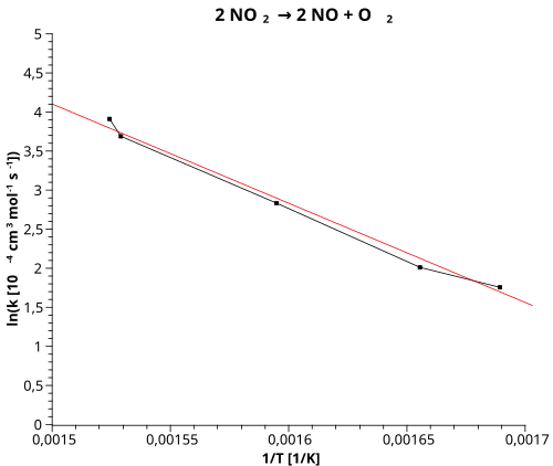 Równanie Arrheniusa w postaci logarytmicznej ma dwie zmienne, i i można je zapisać w postaci w której i są stałymi. Oznacza to, że między a zachodzi zależność liniowa. Dzięki temu, znając doświadczalne wartości stałych szybkości reakcji w kilku temperaturach, można łatwo wyznaczyć zarówno wartość stałej jak i energię aktywacji danej reakcji. Nachylenie uzyskanej linii ma wartość a punkt przecięcia linii z osią rzędnych ma wartość [1][2][3].