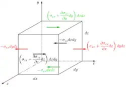 Na ścianki objętości kontrolnej działają siły powierzchniowe. Składowa X tych sił (w formie iloczynu naprężenia i pola powierzchni np. ), dla każdej ścianki, została umieszczona na rysunku z elementem sześciennym.