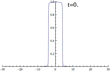 Wykres zmian temperatury kwadratowej płyty, obliczony z równania ciepła. Wysokość i zaczerwienienie wykresu określają temperaturę w punktach płyty. Stan początkowy obejmuje równomiernie gorący obszar w kształcie kopyta (czerwony) otoczony równomiernie zimnym obszarem (żółty). W miarę upływu czasu ciepło rozprzestrzenia się w zimnym obszarze.Numerycznie wyznaczona zmiana temperatury ciała.
