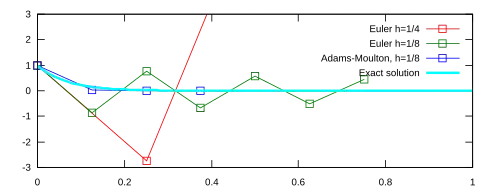 - Metoda Eulera z dwukrotnie mniejszym krokiem, generuje rozwiązanie o mniejszych oscylacjach (kolor zielony).