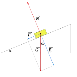 Na ciało działa siła grawitacji G oraz siła reakcji podłoża N równi na nacisk ciała na nią. Siła nacisku jest równa składowej ciężaru normalnej do powierzchni F2. Z rysunku widać, że