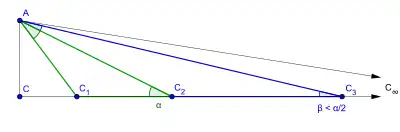 - Niech punktem przecięcia w nieskończoności promieni równoległych będzie punkt Niech będzie takim ciągiem punktów, że Zatem jest równoramienny. Wtedy z twierdzenia o kącie zewnętrznym trójkąta kąt jest mniejszy od połowy kąta Jeśli to czyli a Dlatego można przyjąć, że [21].