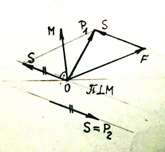 Redukcja układu sił do tak wyznaczonego punktu pozwala wyznaczyć dwa wektory: wektor główny i tzw. skrętnik układu (rys. 1).