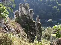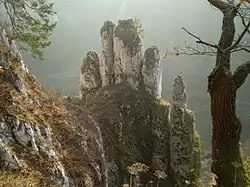 Widok z Doliny Prądnika. Widoczna platforma widokowa Jaskini Ciemnej