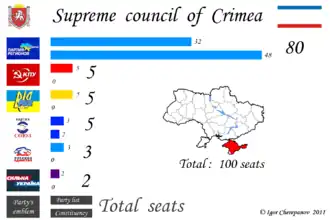 W wyniku wyborów w 2010 większość w 100 miejscowym parlamencie zdobyła Partia Regionów (48,93% głosów; 32 mandaty z podziału proporcjonalnego i 48 w obwodach jednomandatowych).