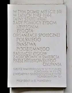 - Tablica upamiętniająca siedzibę sekretariatu Żegoty przy Żurawiej 24 w Warszawie[13].