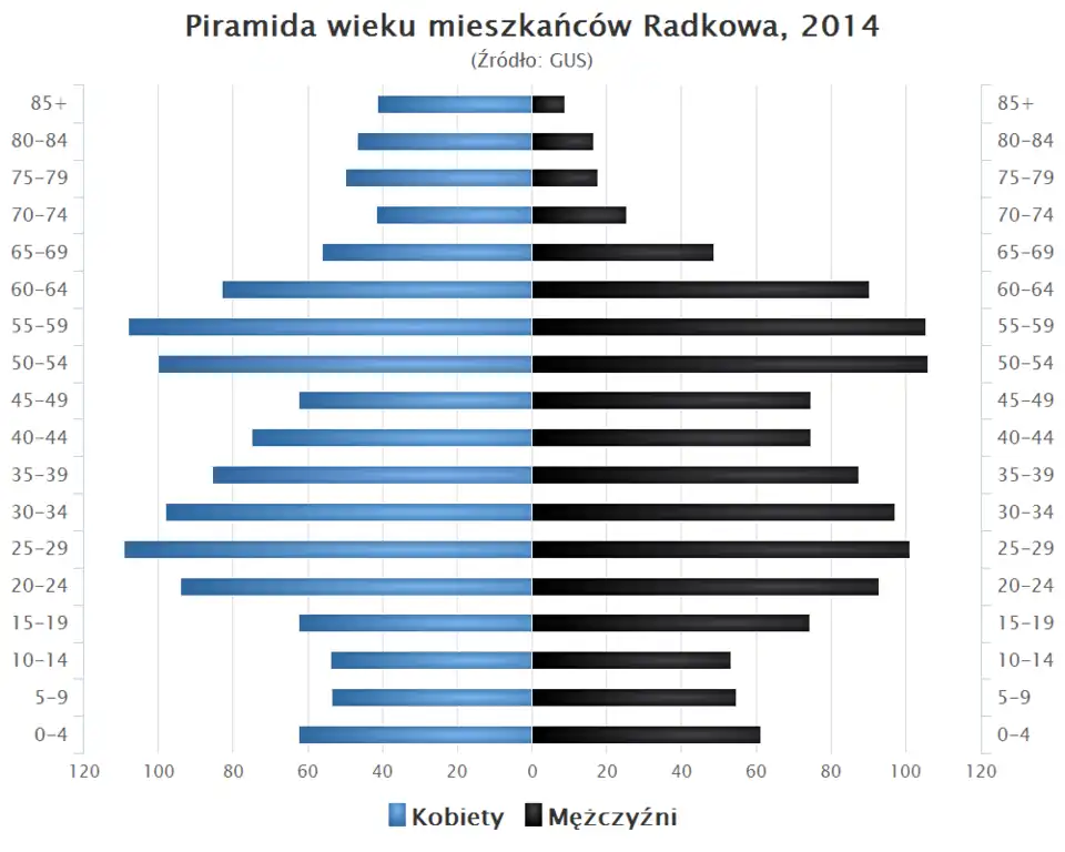 Piramida wieku mieszkańców Radkowa w 2014 roku[9].